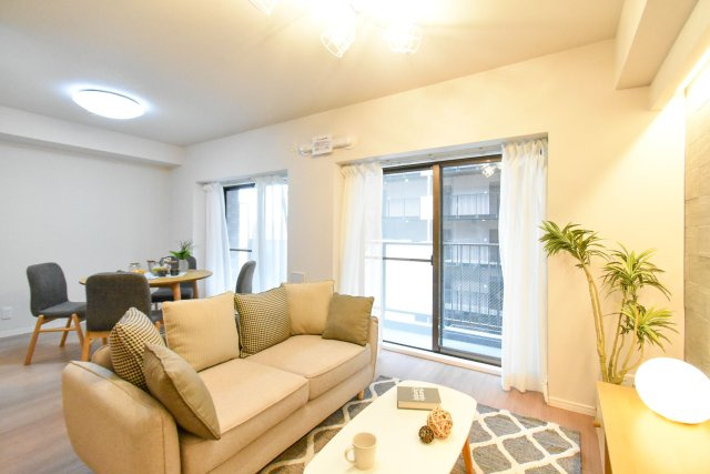 【居間・リビング】リビングです。家具がディスプレイしてありますので入居後のイメージが付きやすいですね♪